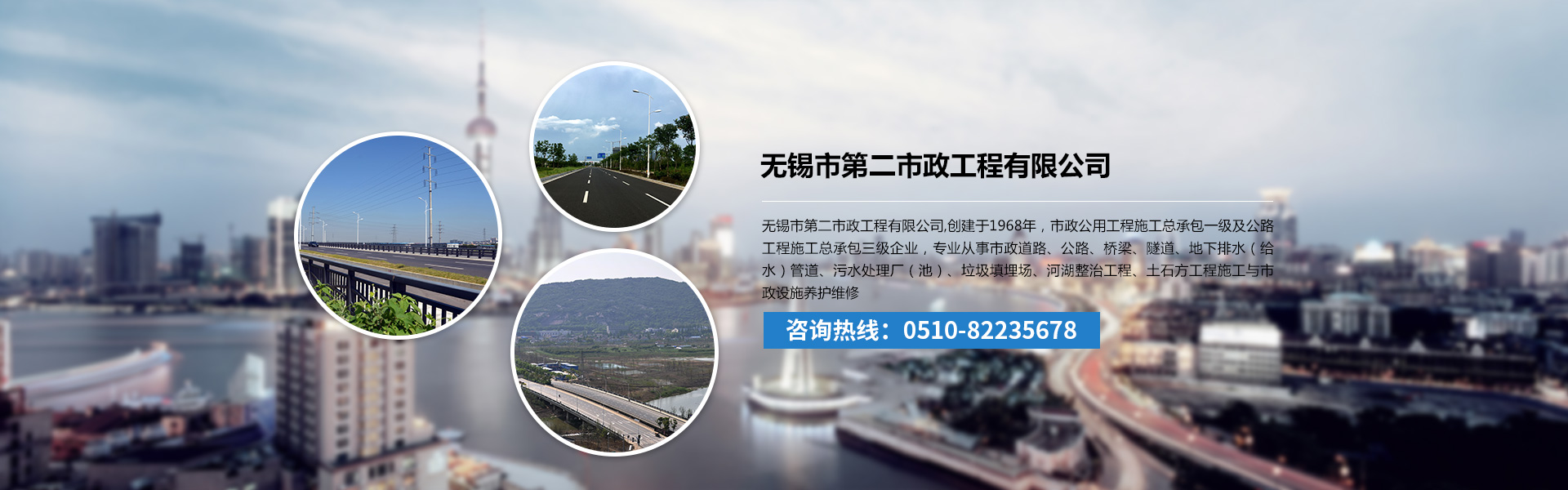 無錫市第二市政工程有限公司創建于1968年,擁有市政公用工程施工總承包一級資質、建筑工程施工總承包二級資質及公路工程施工總承包三級資質。專業從事市政道路、公路、橋梁、房屋建筑、隧道、地下排水(給水)管道、污水處理廠(池)、垃圾填埋場、河湖整治工程、土石方工程施工與市政設施養護維修工作。